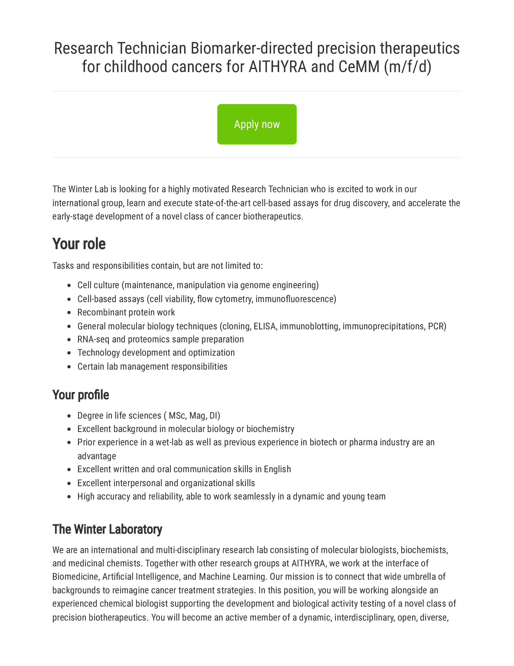 Research Technician Biomarker-directed precision therapeutics for childhood cancers for AITHYRA and CeMM (m/f/d)